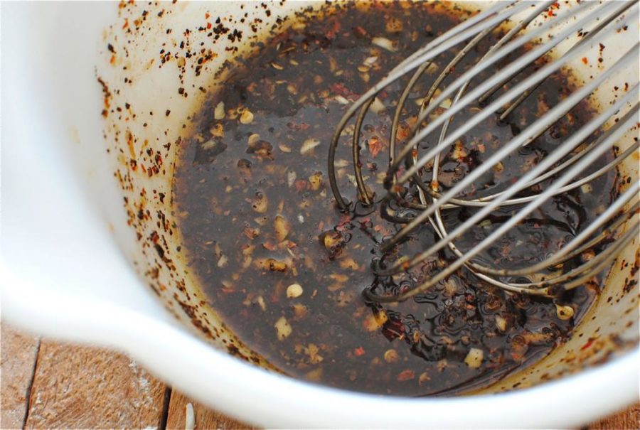 - Мед растворяем в молоке, вводим соус, специи и травы, все хорошенько перемешиваем.
