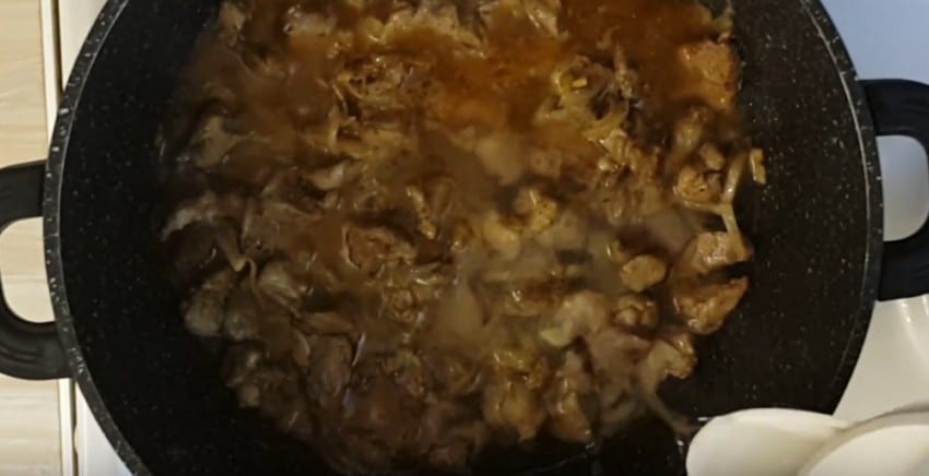 - Полученную массу необходимо тушить примерно 3–5 мин., потом следует залить содержимое емкости горячим бульоном, приправить его солью, затем продолжить процесс.