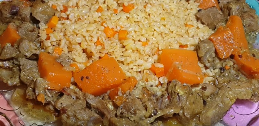 Такой вариант блюда предполагает использование большого количества овощей и восточных специй. Среди них: по 2 шт. редьки, репки, помидоров и лука, по 4 шт. моркови и небольших кабачков, полкило тыквы, пучок веточек кориандра, по щепотке молотого имбиря, куркумы, черного перца, соли. Также потребуется взять по 750 г любого мяса и крупы, 130 г размоченного нута, масло, воду.