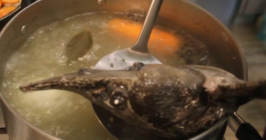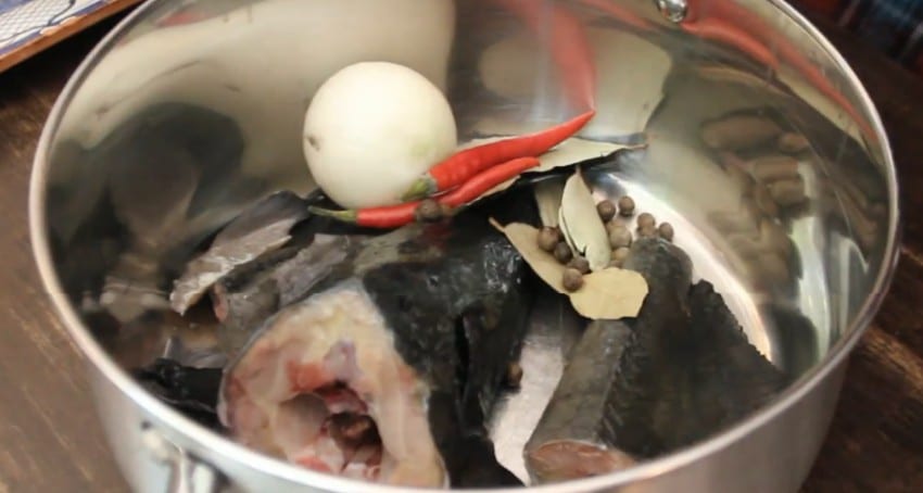 - Итак, сначала нужно опустить голову осетра (и плавники, если есть) в кипящую воду и оставить вариться на медленном огне на время около часа.