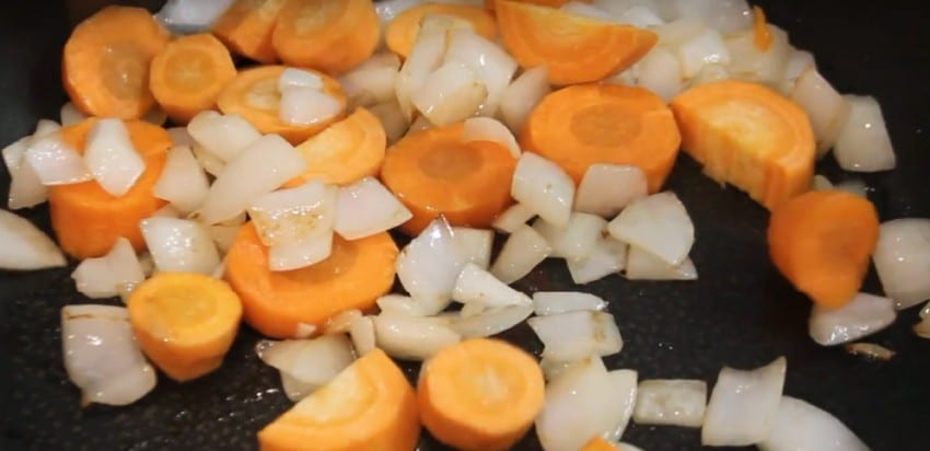 3. Картофель очистите, нарежьте кубиками, морковь — кружками, а луковицу измельчите. На растительном масле обжарьте лук до золотистого цвета, после чего добавьте морковь и готовьте до мягкости.