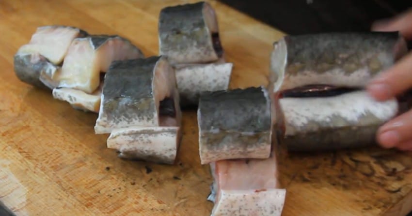 1. Тушку промойте, отрежьте голову, хвост и плавники. Оставшуюся часть нарежьте на куски и отложите в сторону.