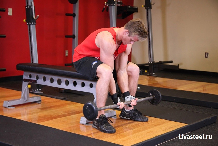 1. Берем штангу узким хватом и садимся на скамью таким образом, чтобы локти оказались между колен;