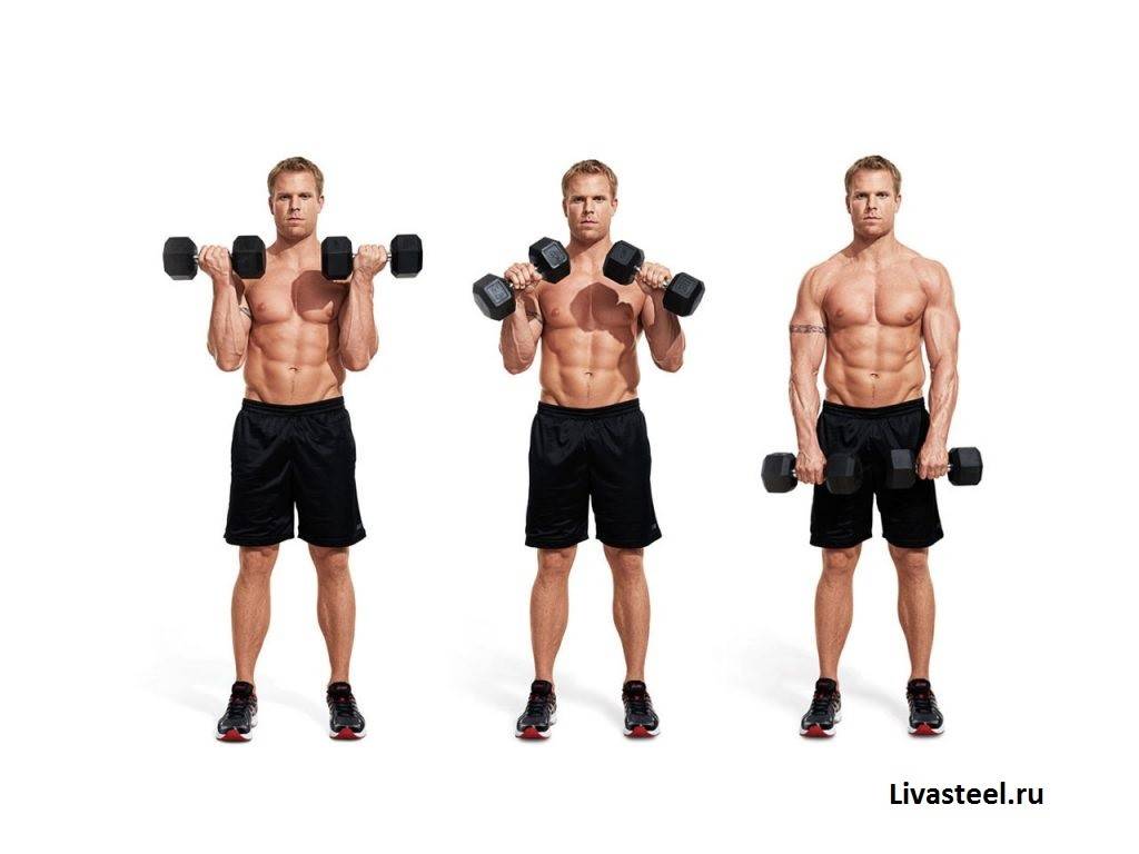 2. Совершите подъем на бицепс, но перед тем как опустить руку, разверните кисть ладонью вниз и плавно опустите руку с гантелью вниз.