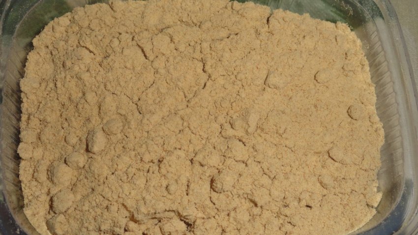Сушёный молотый корень выглядит как мучнистый порошок серо-жёлтого или молочного цвета. Какой у него вид, можно посмотреть на фото. Вкус у него пряный, острый с горчинкой. Он несколько отличается от свежего. Аромат резкий, свежий.