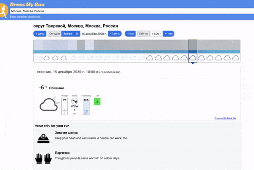Чтобы точно определить, как одеться на пробежку, воспользуйтесь сайтом Dress My Run. Он понимает русский язык и сможет подобрать подходящий гардероб для пробежки. В параметрах нужно указать температуру и погодные условия. А дальше сайт определит, что вам надеть. Напомнит даже про солнечные очки.