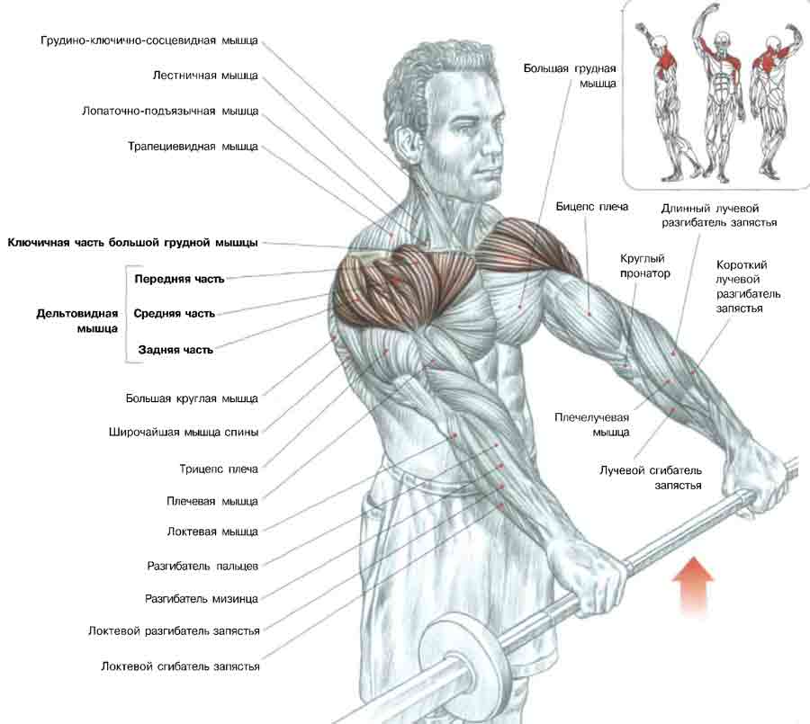 Жим штанги с груди — это наиболее базовое упражнение, которое более всего нагружает переднюю и среднюю части дельтовидных мышц, ключичную часть грудной мышцы, верхний отдел трапециевидных мышц, трицепсы, передние зубчатые мышцы и глубоко расположенную надостную мышцу.Жим штанги с груди можно выполнять как в положении сидя, так и в положении стоя. Выполняя это упражнение в положении стоя, не следует слишком сильно прогибать поясницу. Чтобы увеличить нагрузку на передние части дельтовидных мышц, заведите локти слегка вперед. Для более интенсивного воздействия на средние отделы дельтовидных мышц локти лучше раздвинуть (развести в стороны).