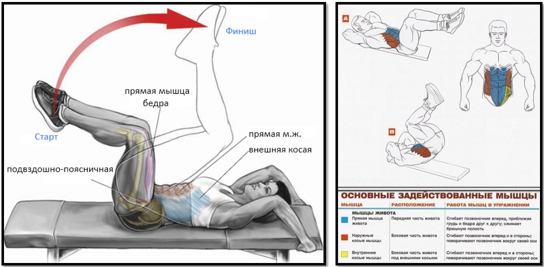 Заключается данное упражнение в том, что, лежа спиной на скамье (лавке или скамейке, если выполнять дома) и держась руками за снаряд, осуществляют сближение ног с корпусом путем их подъема по дугообразной траектории с постепенным неполным сгибанием в коленях и отрывом поясницы от рабочей поверхности. При этом прорабатывается очень большой мышечный ансамбль: