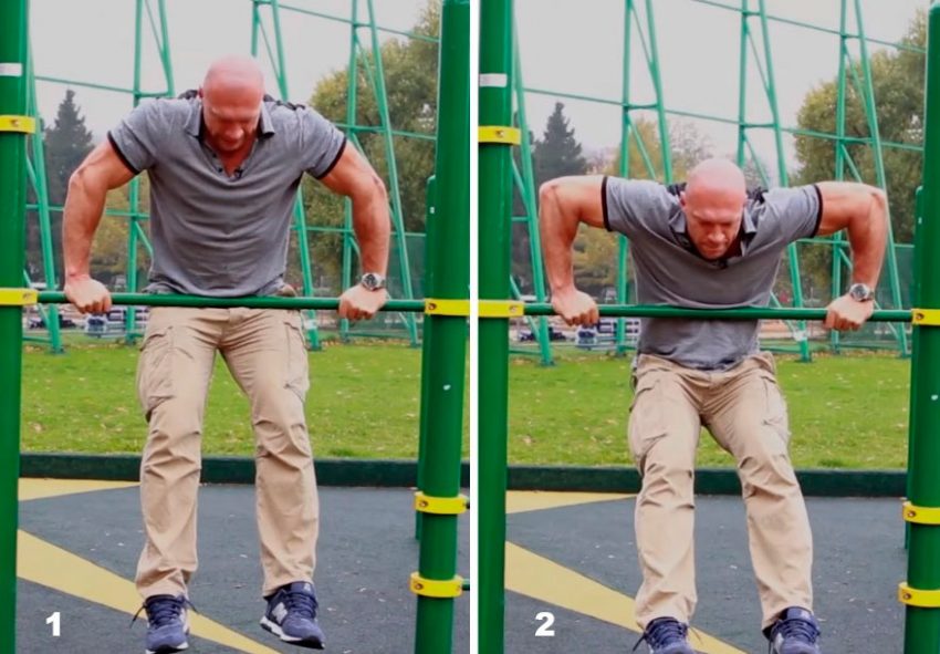 Стоя вдоль перекладин, оттолкнитесь ногами от земли, затем прямым руками хватайтесь за брусья. Держитесь ровно. Плавно спрыгните. На брусья нужно выходить за счет рук и плечей.
