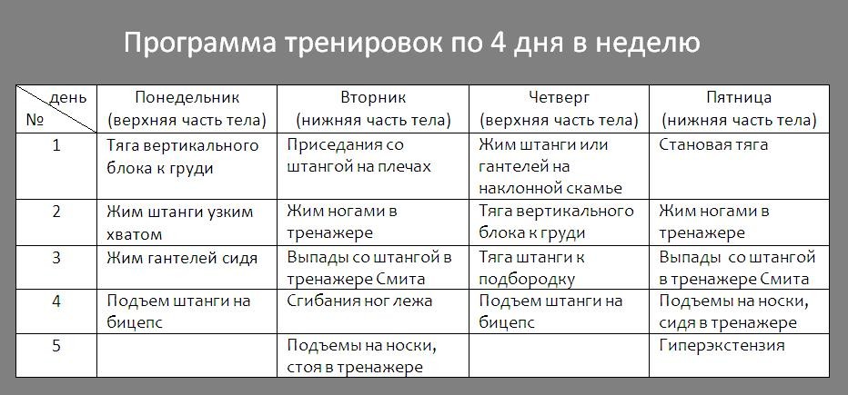 В данном варианте сплита в отдельный день выведены руки. Аналогичным образом можно сделать упор на дельты – делать их в понедельник, а трицепс вместе с грудью и бицепс со спиной. Выбирайте сами, какая часть тела нуждается в более точечной прокачке.