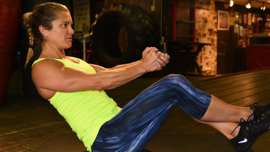- Боковые скручивания выполняются на выдохе. Приподнимите корпус, подтягивая локоть вперед. Задержитесь на секунду и опуститесь.
