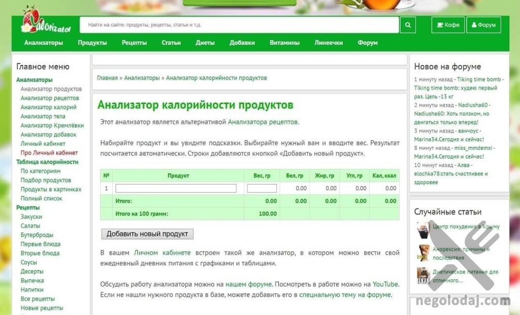- calorizator.ru – тоже, можно вносить свой продукт и рецепт, но в рецепте нельзя учитывать термообработку продукта и его конечный выход.