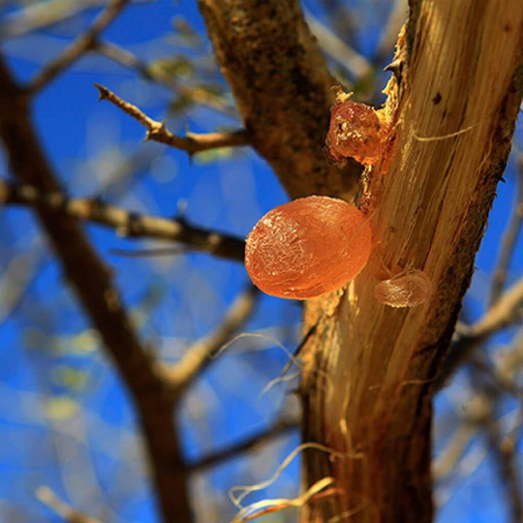 Гуммиарабик собирается не из искусственных надрезов деревьев, а вытекает естественным образом из разломов и трещин на ветвях и коре деревьев.