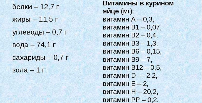 В куриных яйцах присутствует целый ряд аминокислот, витаминов, микро- и макроэлементов и минеральных соединений.