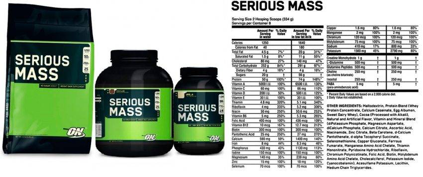 - Serious Mass (создатель – Optimum Nutrition) – это протеиново-углеводная смесь, разработанная специально для худощавых спортсменов. В суточной норме содержится 50 г белка и 250 г углеводов. Энергетическая ценность продукта – 1 500 Ккал. В состав добавки включены минералы и витамины, а также креатин, который способствует скорейшему построению мышечной массы.