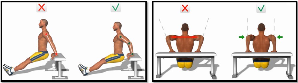 Движения при отжиманиях от скамьи должны быть направлены строго вверх-вниз, а не по диагонали.