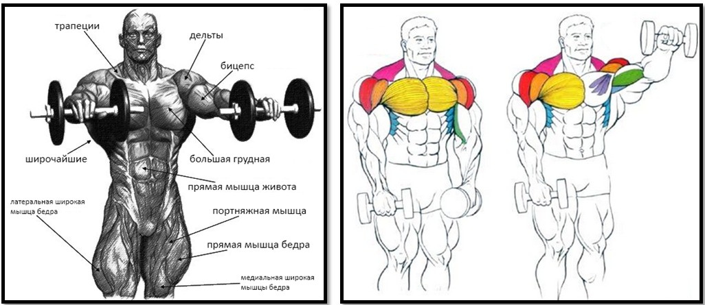 Поднятие гантелей требует стабилизации корпуса, поэтому мышцы брюшного пресса, спины и ног тоже немного включаются в работу.