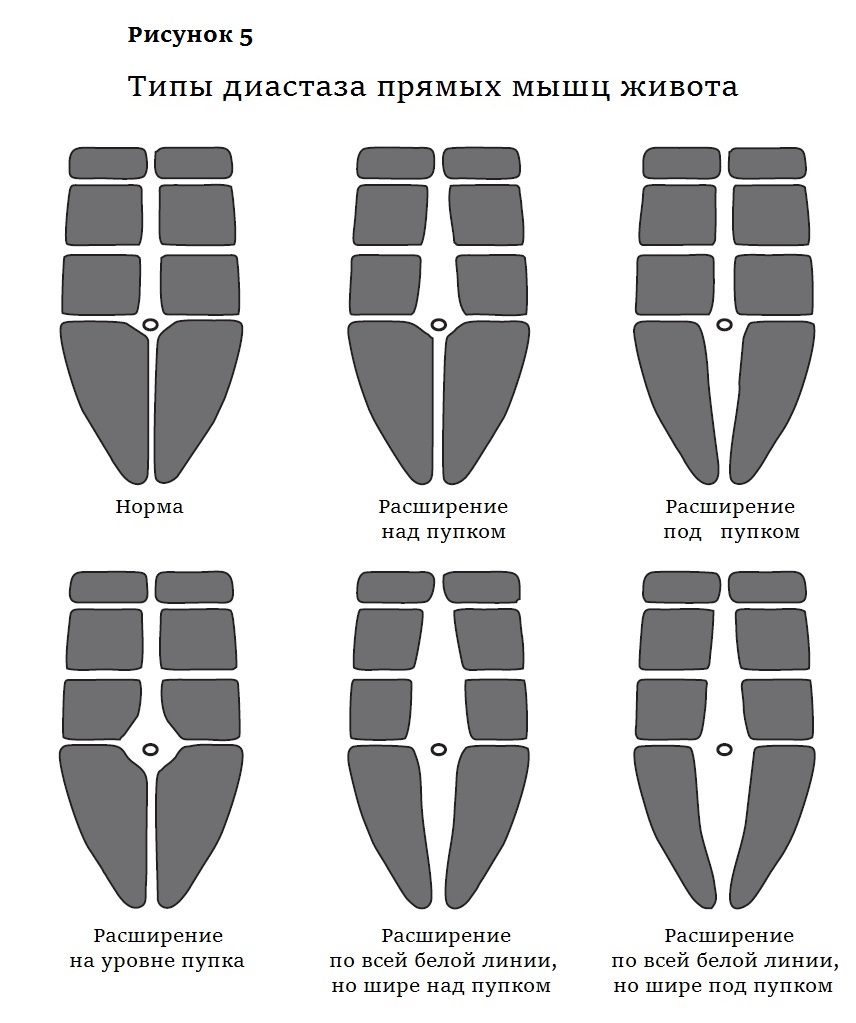 При ДПМ в начальной стадии расширение в области пупка невелико, отклонение от нормы не превышает 5 см. Такие изменения практически не отражаются на форме живота. При 2-й степени патологии, когда отклонение увеличивается до 7—8 см, живот отвисает. Это косметический дефект, вызывающий психологический дискомфорт. Ширина белой линии более 8—10 см указывает на тяжелую форму диастаза прямых мышц. Такой ДПМ может существенно