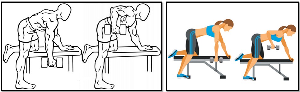 - Берем горизонтальную скамью, ставим на край скамьи правое колено (при этом работать первой будет левая рука). Сохраняя позвоночник прямым, наклоняемся вперед, и упираемся в поверхность скамьи правой рукой. Корпус при этом должен оказаться параллельно или почти параллельно полу. В левую руку берем гантель и свободно выпрямляем ее, при этом слегка опуская вниз левый плечевой сустав. Ладонь при этом направлена в сторону скамьи. Это – исходная.